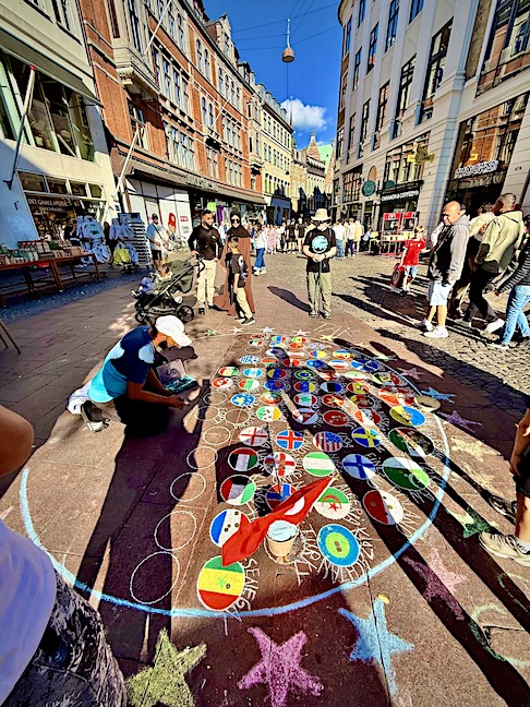 A street artist creates a globe filled with round flags from many countries using colored chalk.