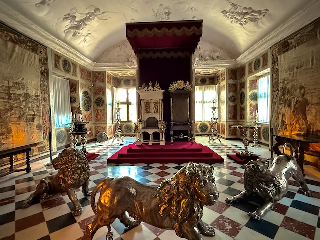 Rosenborg Castle’s Knights’ Hall displays the coronation thrones accented with narwhale tusks, and three life-size silver lions on guard. The walls are adorned with tapestries depicting Denmark and Sweden’s major battles.