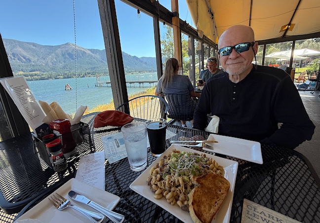 Chasing waterfalls is exhausting. Hungry and thirsty, we crossed the Columbia River on the Bridge of the Gods to the Washington side in search of a meal with a view.